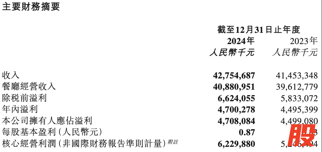 该公司披露的业绩显示,2024年,海底捞营收427.5 亿元,同比增长3.1%;归母净利润47.08亿元,同比增长4.7%。